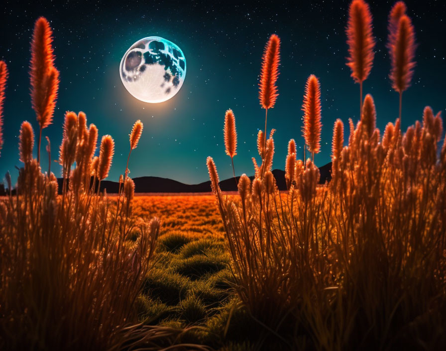 A duck hidden in red reeds under moonlight