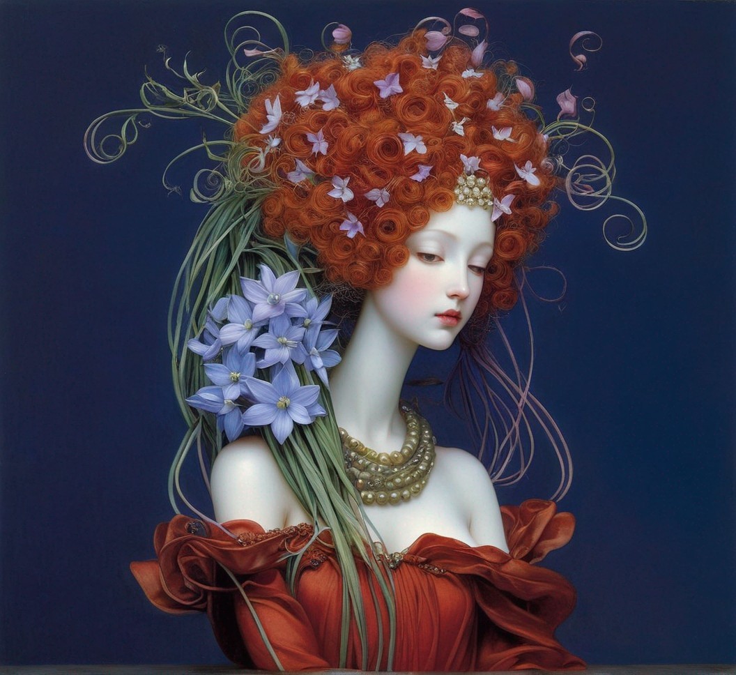 Portrait of Woman with Red Hair and Pink Flowers Holding Blue Bouquet
