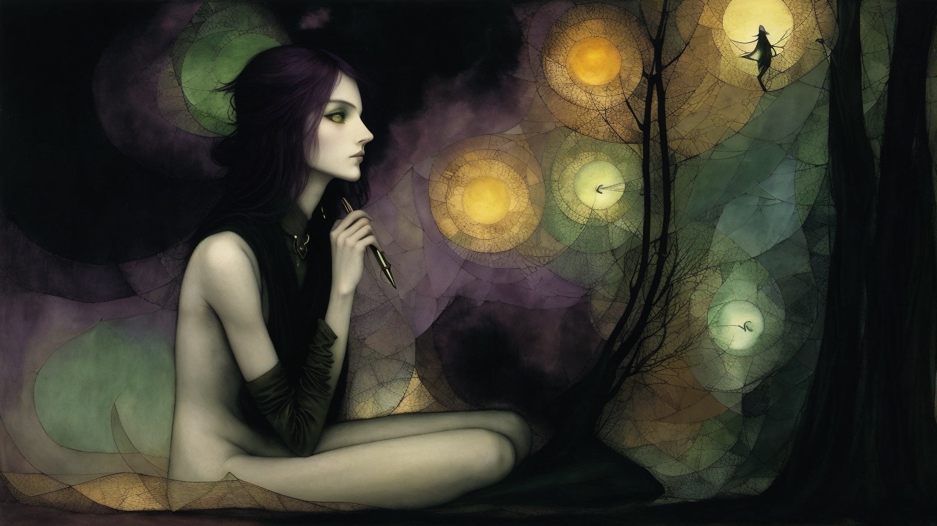 A whimsical fairy with fiery red curls sits gracefully in a dark forest. She wears a flowing green gown, surrounded by glowing fireflies under a starry night sky and a luminous moon.