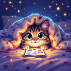 A cute cat with big, sparkling eyes peeks out from a starry blanket, eagerly using a smartphone. Warm lights twinkle around, creating a cozy, whimsical nighttime scene.