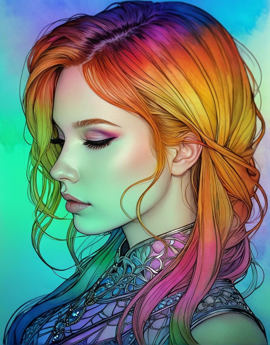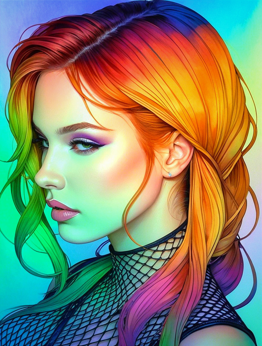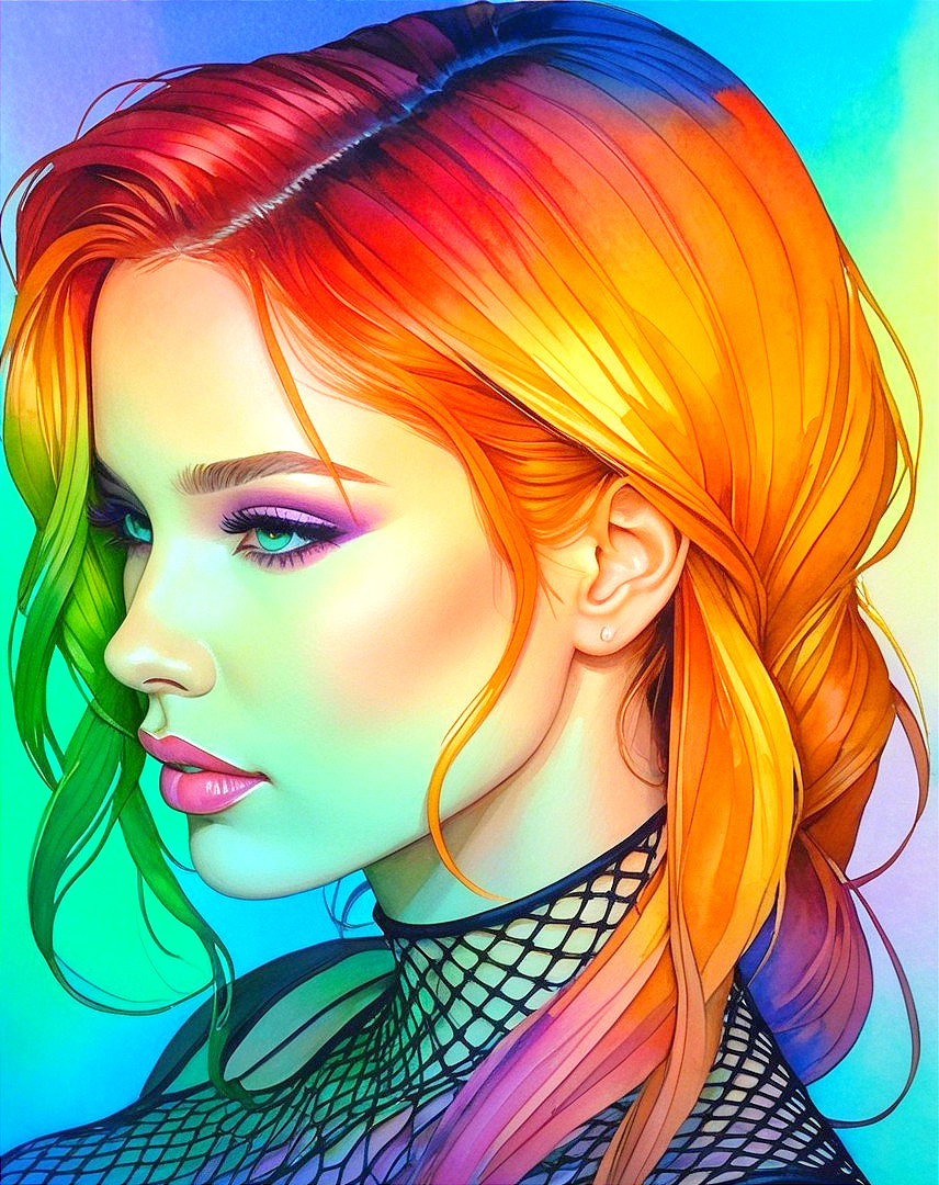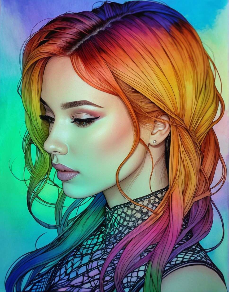 A vibrant portrait of a woman with long, rainbow-colored hair styled in waves. She has striking makeup, including bold purple eyeshadow and glossy lips, set against a colorful gradient background.