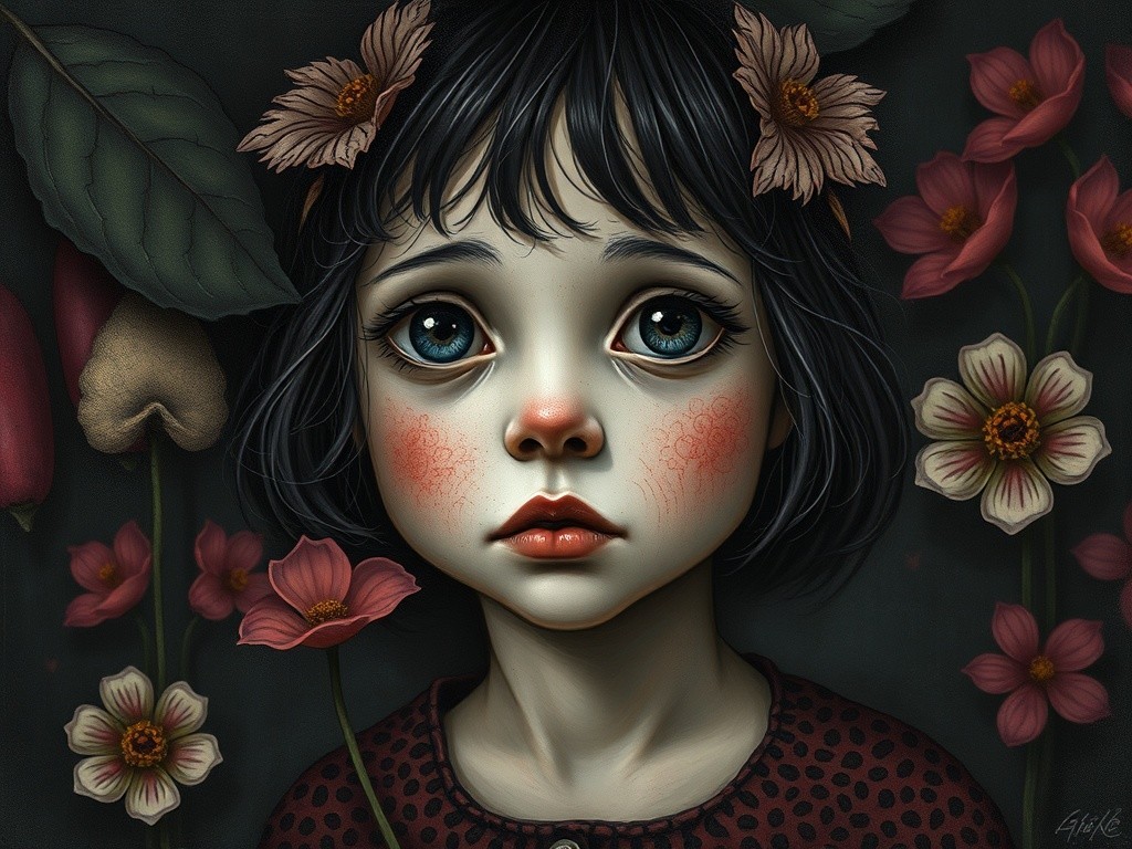 An illustration of a girl with purple hair and large, expressive eyes, surrounded by green and purple leaves.