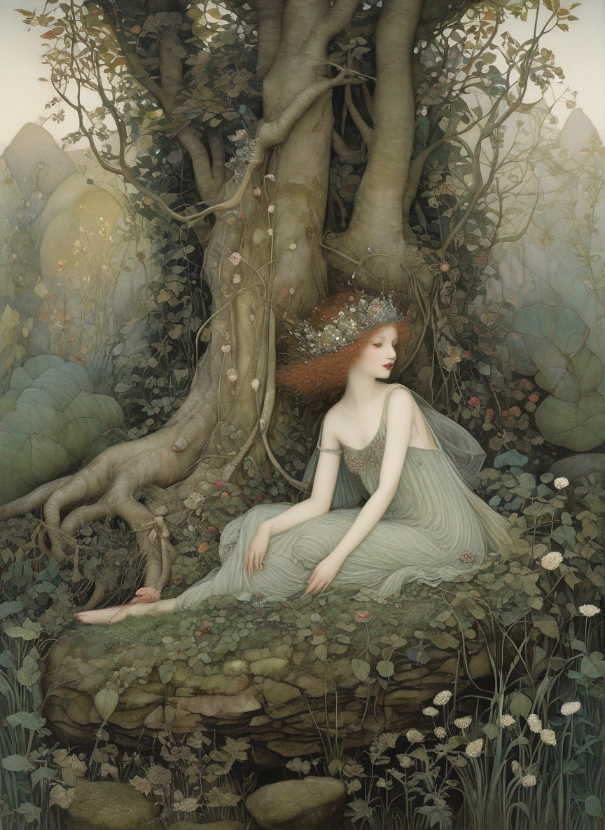 Pale red-haired woman with tiara in roots of ancient tree among flowers
