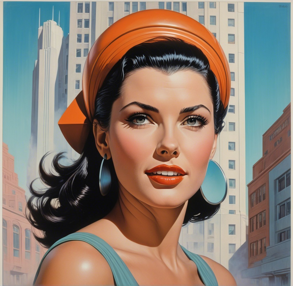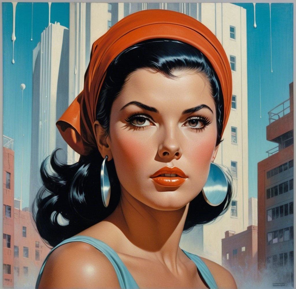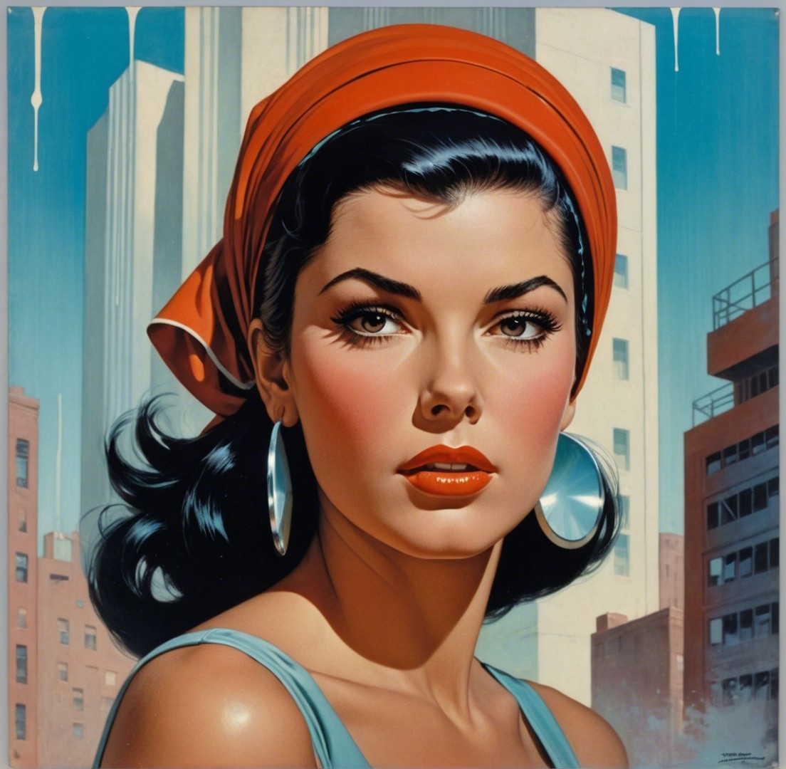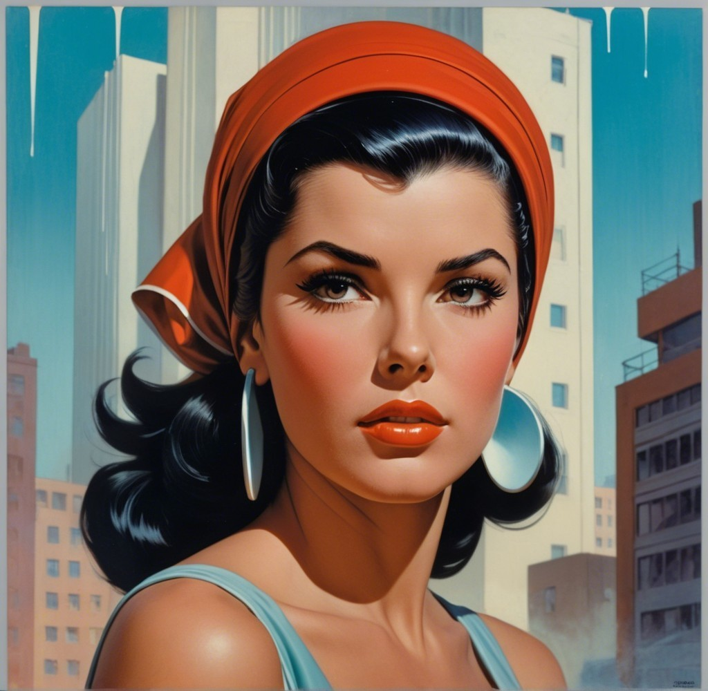 Prompt: Layered and stylized portraiture by Ed Binkley and John Buscema, headscarf, liminal, beautiful 1960's comic book art, complex stylization, surrealistic vibe, dripped details, split toning, orphism, unfinished, split tones, dof, debeh, bokeh, ambient occlusion 1.3, raytraced shadows 1.3, colourful surreal line-art, contouring forms, Magical realism of John Buscema, nuanced painterly, simplistic outlines, warped, tall and lean details, modernism, complex coloring reminiscent of post-avantgarde style, fine-line art executed with micro-pens, juvenile hues by Margaret Keane, transitions of brightness, overall painting by Richard Serra. intricate geometries, mixed media masterpiece, liminal, merged styles of Vilhelm Hammershøi and Ed Binkley and Pierre Bonnard, embodiment by Henri Matisse & Ho Baron, lighting by Henri de Toulouse-Lautrec, splashed and opaque and translucent background, sci-fi artwork, pastel harmony, estranged lighting, dreamy movement, painterly color scheme light-green sea-green lawn-green. Drawing inspiration from the styles of Lawrence Schwinger and Stan Lee, the dynamic lighting by Cecilia Frigati and Esao Andrews, displacement mapping 1.3, visible textures, shadow mapping 1.3, mip-mapping 1.3, phong shading 1.3, mesmerizing fusion of vine and oiled charcoal textures, compressed charcoal, black outlines, black conte crayon, creating a rich tapestry of textures. Streamline_moderne influence, Reduction, simplicity, perpendicular line-art featuresnoticeable, wavery inking in hues by Overton Loyd, Colorful Vision on canvas, rim lighting, parallax occlusion 1.3 inspired by Man Ray, color glitch aesthetics, subsurface scattering 1.2, brightness 1.3,