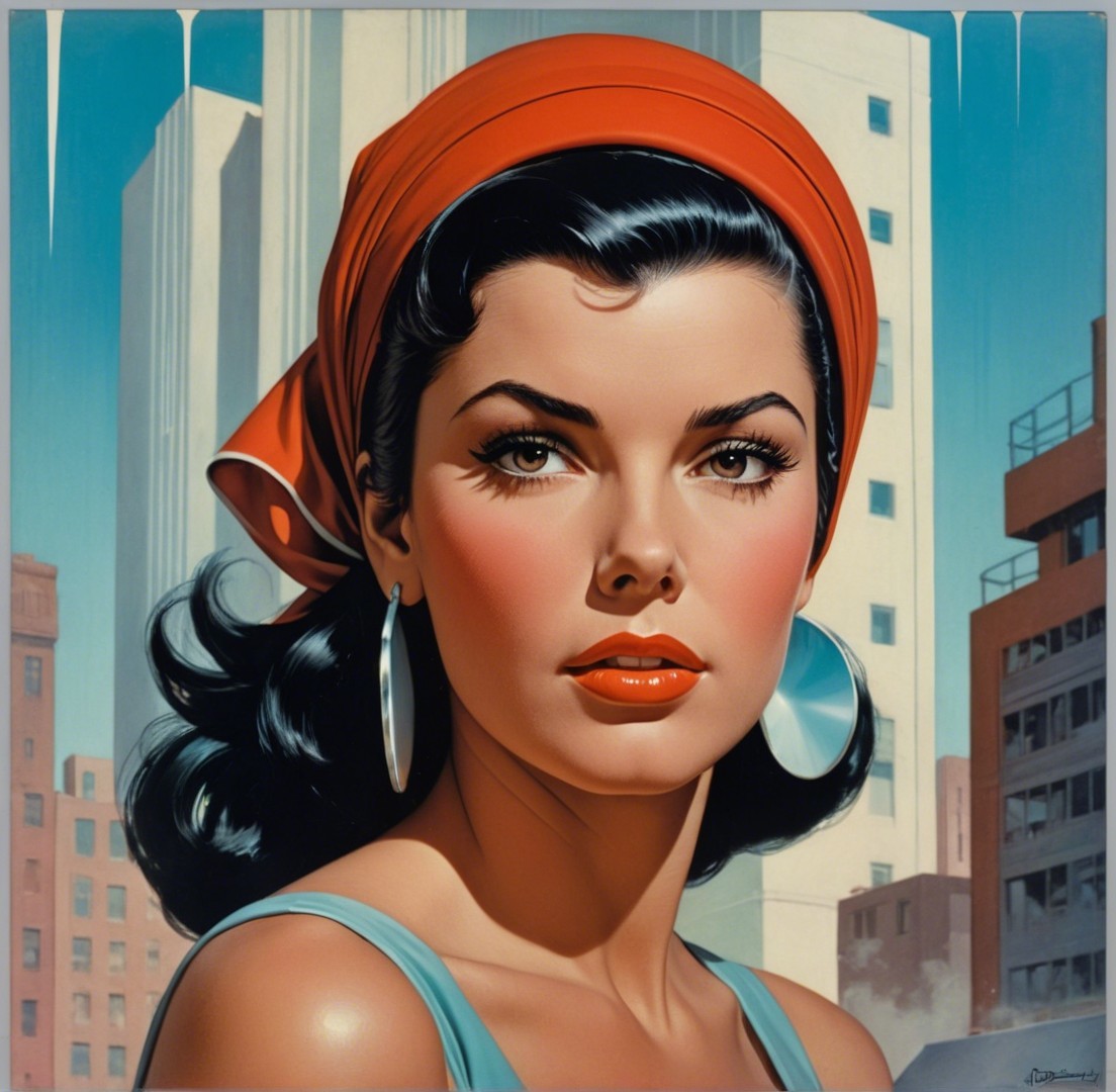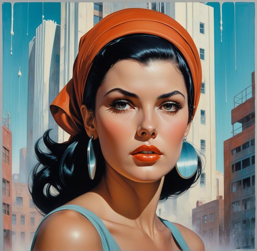 Layered and stylized portraiture by Ed Binkley and John Buscema, headscarf, liminal, beautiful 1960's comic book art, complex stylization, surrealistic vibe, dripped details, split toning, orphism, unfinished, split tones, dof, debeh, bokeh, ambient occlusion 1.3, raytraced shadows 1.3, colourful surreal line-art, contouring forms, Magical realism of John Buscema, nuanced painterly, simplistic outlines, warped, tall and lean details, modernism, complex coloring reminiscent of post-avantgarde style, fine-line art executed with micro-pens, juvenile hues by Margaret Keane, transitions of brightness, overall painting by Richard Serra. intricate geometries, mixed media masterpiece, liminal, merged styles of Vilhelm Hammershøi and Ed Binkley and Pierre Bonnard, embodiment by Henri Matisse & Ho Baron, lighting by Henri de Toulouse-Lautrec, splashed and opaque and translucent background, sci-fi artwork, pastel harmony, estranged lighting, dreamy movement, painterly color scheme light-green sea-green lawn-green. Drawing inspiration from the styles of Lawrence Schwinger and Stan Lee, the dynamic lighting by Cecilia Frigati and Esao Andrews, displacement mapping 1.3, visible textures, shadow mapping 1.3, mip-mapping 1.3, phong shading 1.3, mesmerizing fusion of vine and oiled charcoal textures, compressed charcoal, black outlines, black conte crayon, creating a rich tapestry of textures. Streamline_moderne influence, Reduction, simplicity, perpendicular line-art featuresnoticeable, wavery inking in hues by Overton Loyd, Colorful Vision on canvas, rim lighting, parallax occlusion 1.3 inspired by Man Ray, color glitch aesthetics, subsurface scattering 1.2, brightness 1.3,