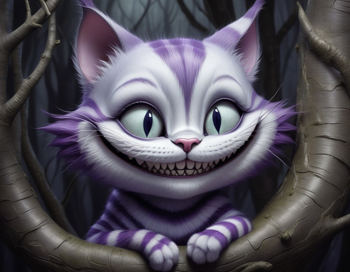Prompt: "[Cheshire cat] grey with purple stripes with an exaggerated grin, close-up, stylization by Nicoletta Ceccoli, highlighted sharp tooth, nestled in elegant [Tree], symmetrical composition, digital painting, dramatic lighting, ultra fine details."
