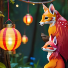 Three vibrant fox figurines seem to interact under glowing lanterns amid a whimsical forest scene, surrounded by soft green moss and delicate pink blossoms, evoking a magical atmosphere.