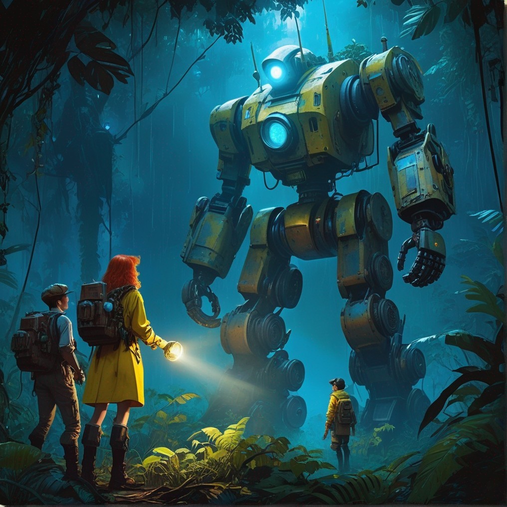 Two explorers and a child meet a large, friendly robot in a misty, lush jungle.