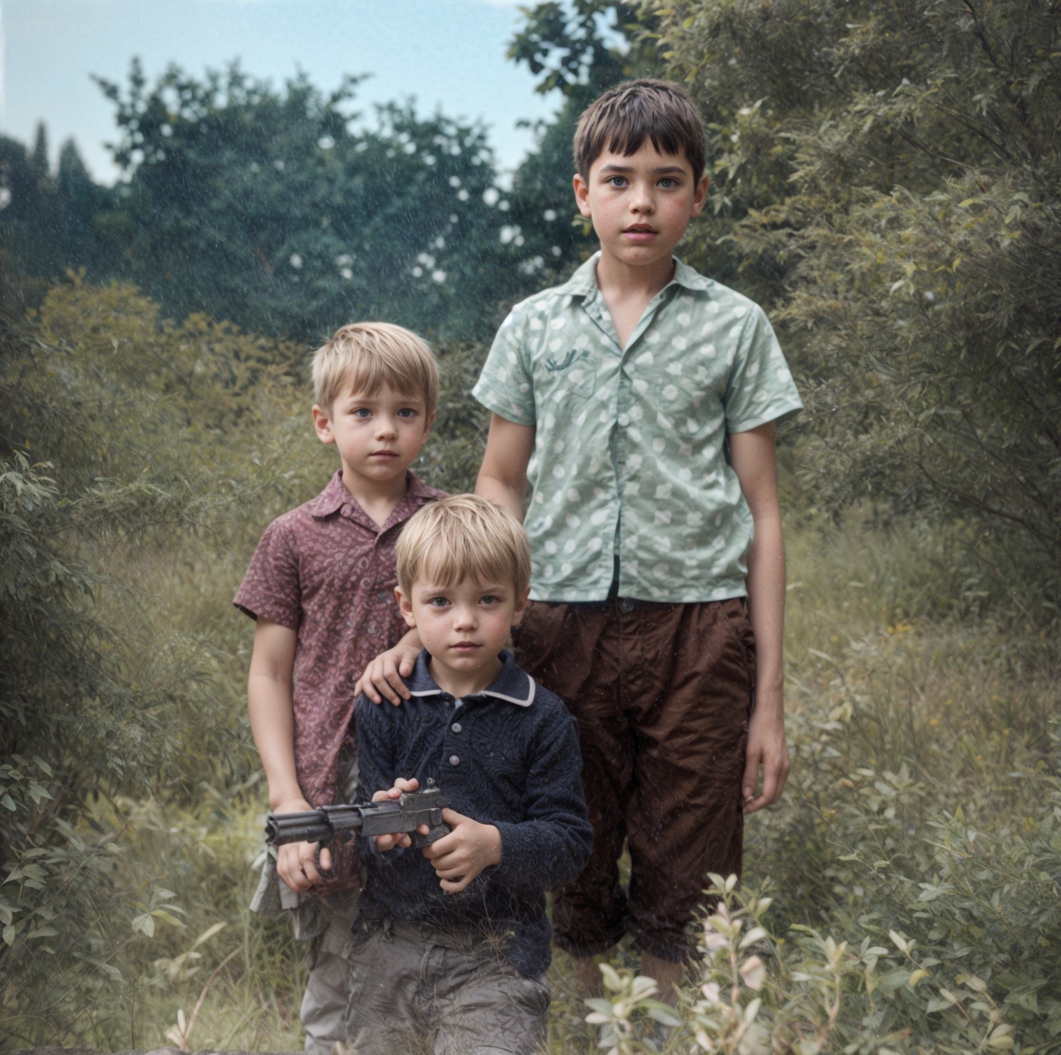 Three young boys stand together in a lush green setting. The tallest boy, wearing a light green shirt, gazes ahead, while the others appear more playful, one holding a toy gun.