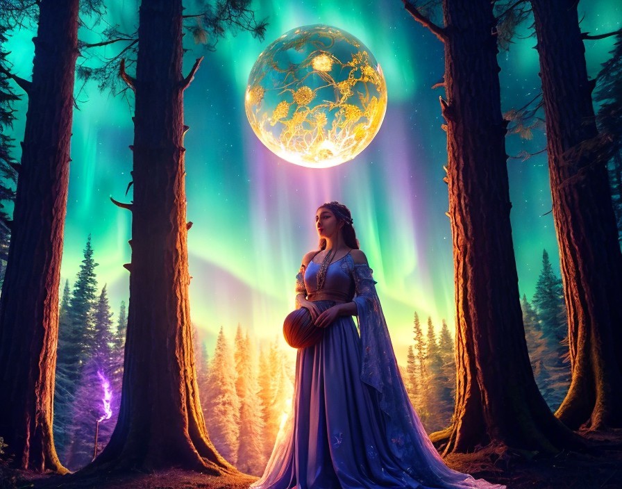 Prompt: Under a mystical dragon aurora in a magical twilight sky, a European woman stands in an ancient forest clearing, elegantly dressed, holding a glowing celestial orb—a gift from the dragon spirit. Ancient scrolls float around, revealing legendary dragon tales, symbolizing wisdom and strength for the Year of the Dragon. This scene blends magic, celebration, and woman's personal journey, with the northern lights forming a dragon's silhouette, emphasizing the enchanting bond between the woman and the mythical.