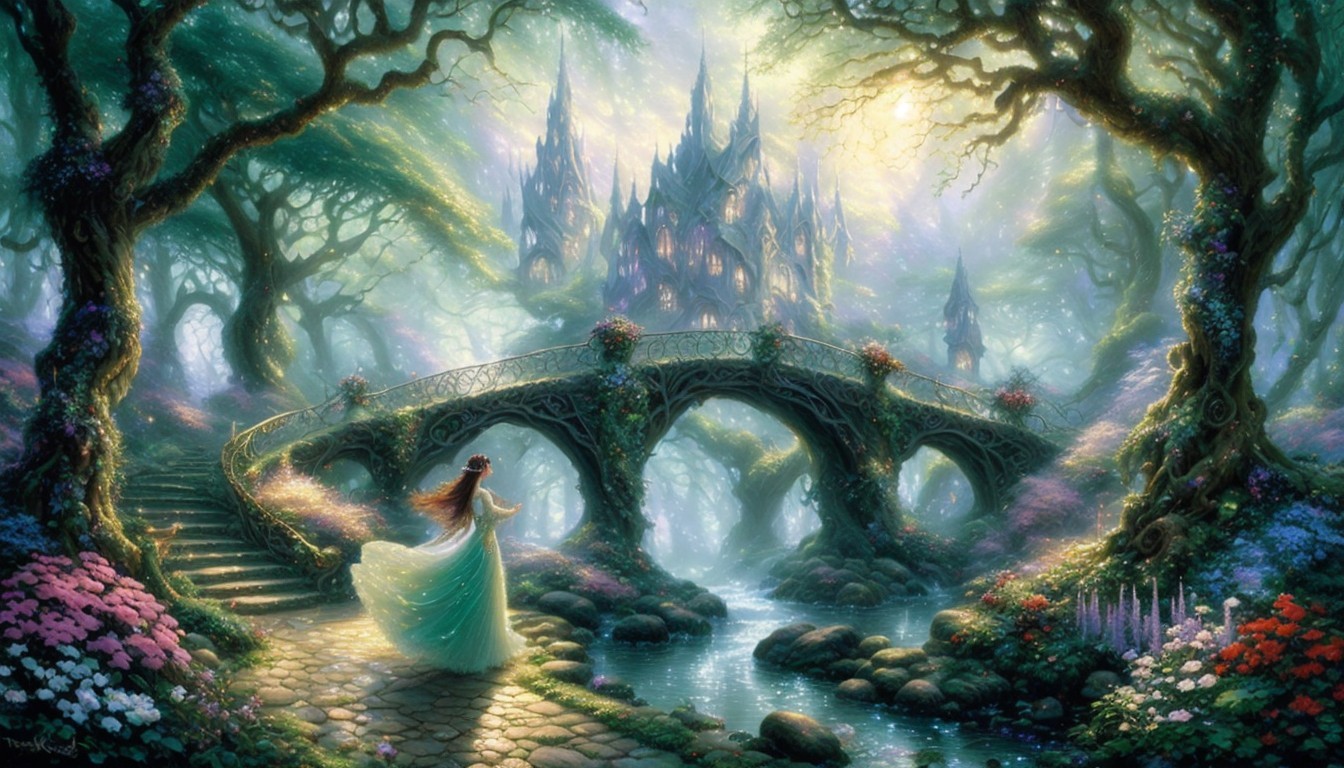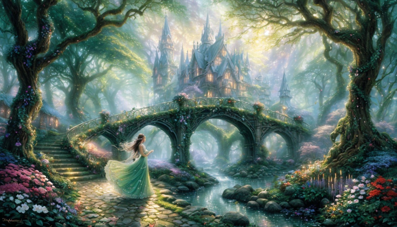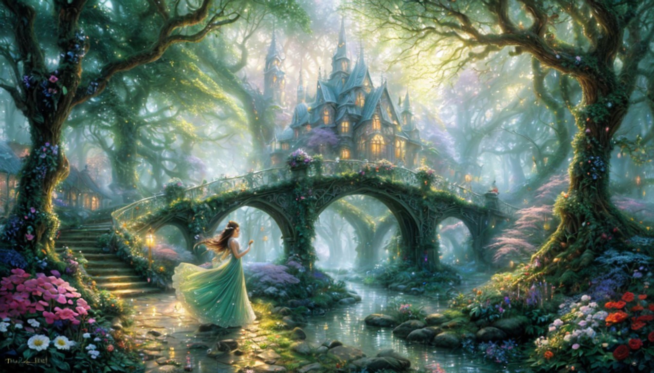 A woman in a flowing dress stands by a mystical bridge amidst a vividly colored, enchanted forest with a castle in the background.