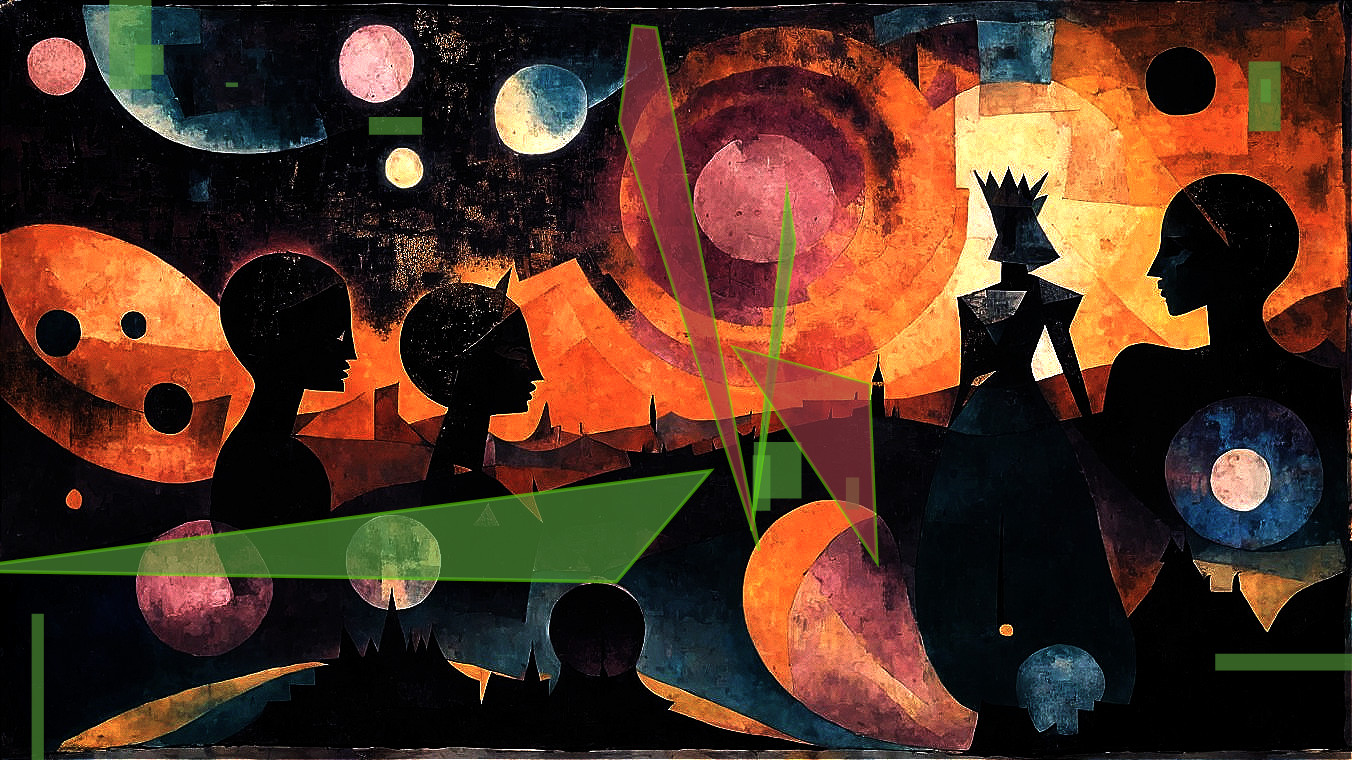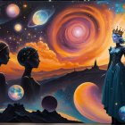 The artwork features bold, abstract shapes and vibrant colors, with silhouettes of figures and stylized flowers against a dynamic background of curves and celestial elements.