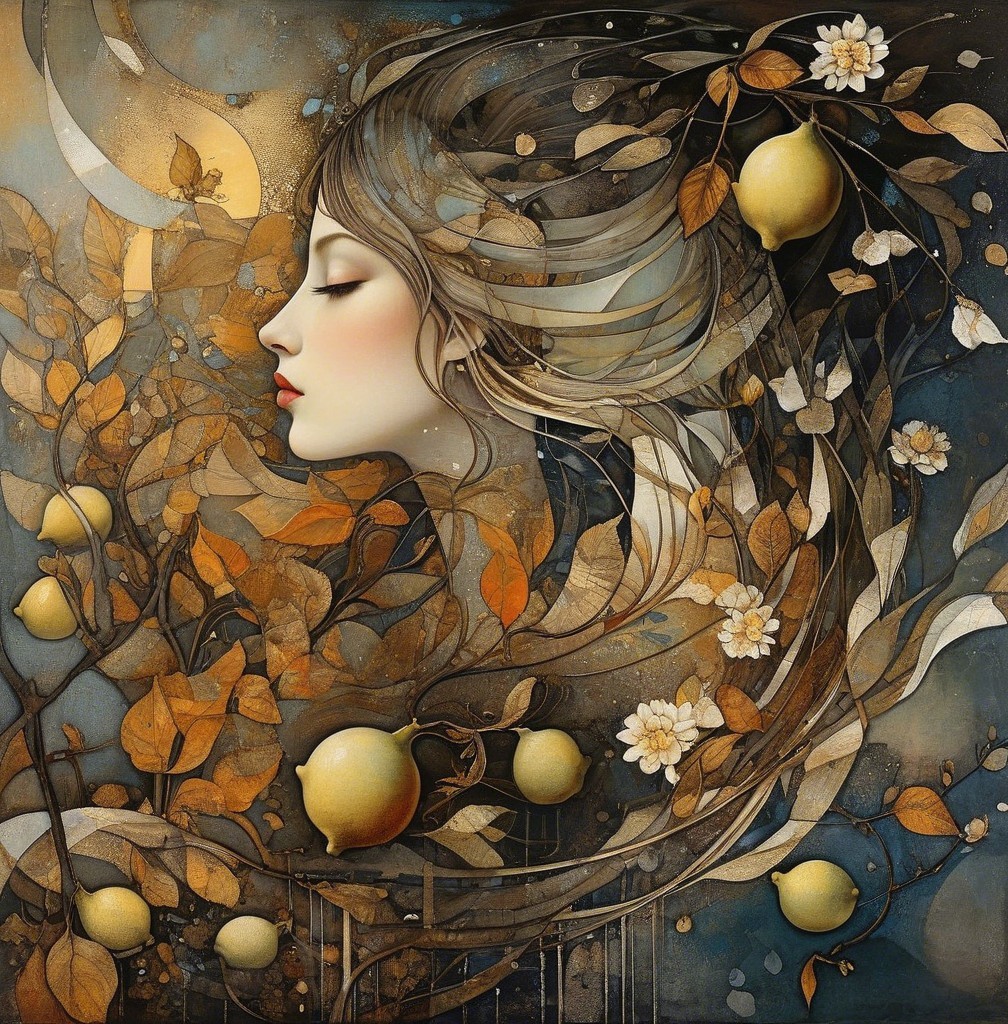 A serene, graceful woman with flowing golden hair is surrounded by swirling vines and vibrant lemons, set against a dreamy, starry background, evoking a sense of beauty and tranquility. Prompt by Eva W.