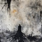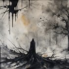 A shadowy figure draped in black stands amidst a bleak, monochrome landscape. Gnarled trees loom, and dark splashes of paint evoke a sense of mystery and foreboding in the eerie atmosphere.