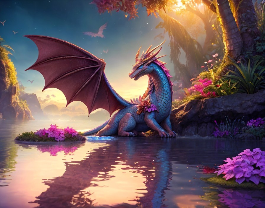 A beautiful fairy-tale dragon in garden, beautiful curls on the wings, a reflection of a dragon can be seen in water, tropical landscape, beautiful vignettes around the perimeter of the picture in the Gzhel style, illustration, Gzhel style - this can be seen around the perimeter of the drawing. extremely detailed 4k beautiful crisp quality Unreal Engine colourful very cute child drawing pixel art V..Z.Tsyganov Viktor Tormosov