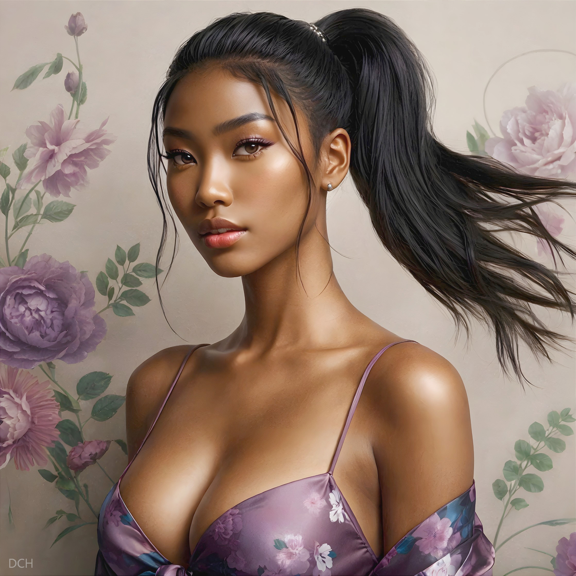 A stunning woman with a high ponytail, wearing silk floral lingerie, is portrayed against a backdrop of delicate pink and mauve flowers.