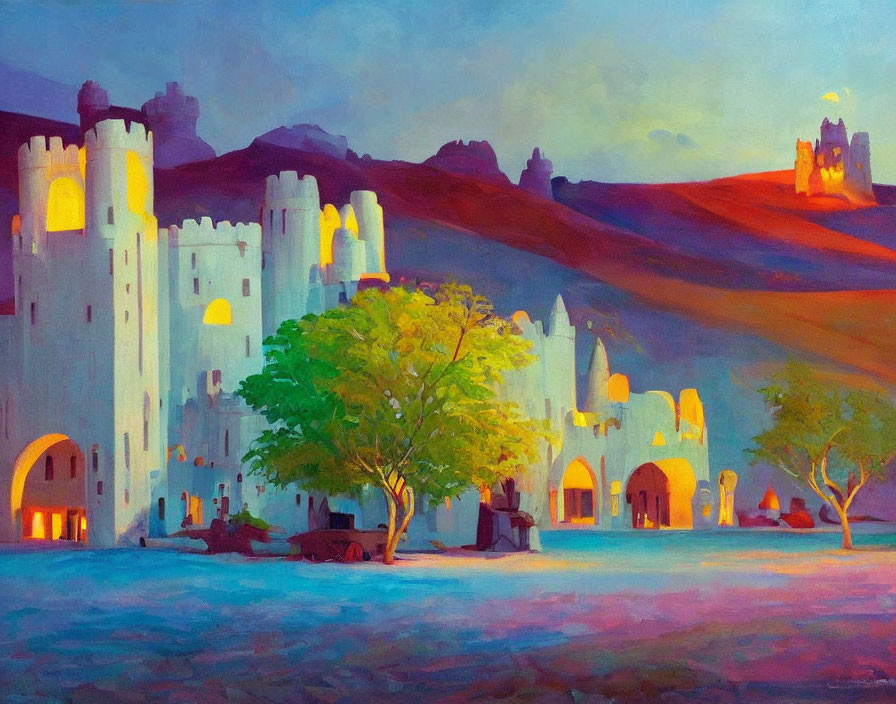 Prompt: "night desert castle, drywall, many multi-colored lit windows, towers, ramparts, combined gauche style of Lawren Harris and Simon Stalenhag and Thomas W Schaller"