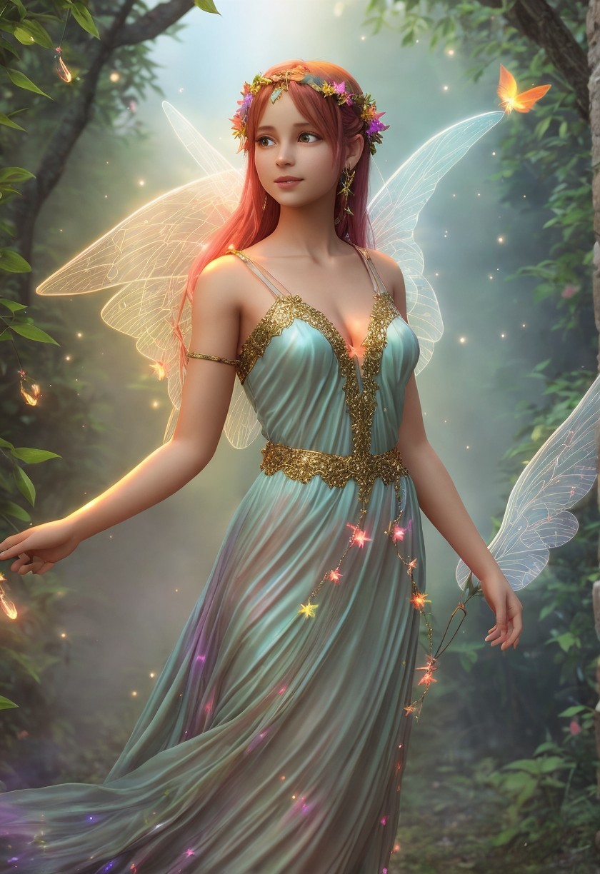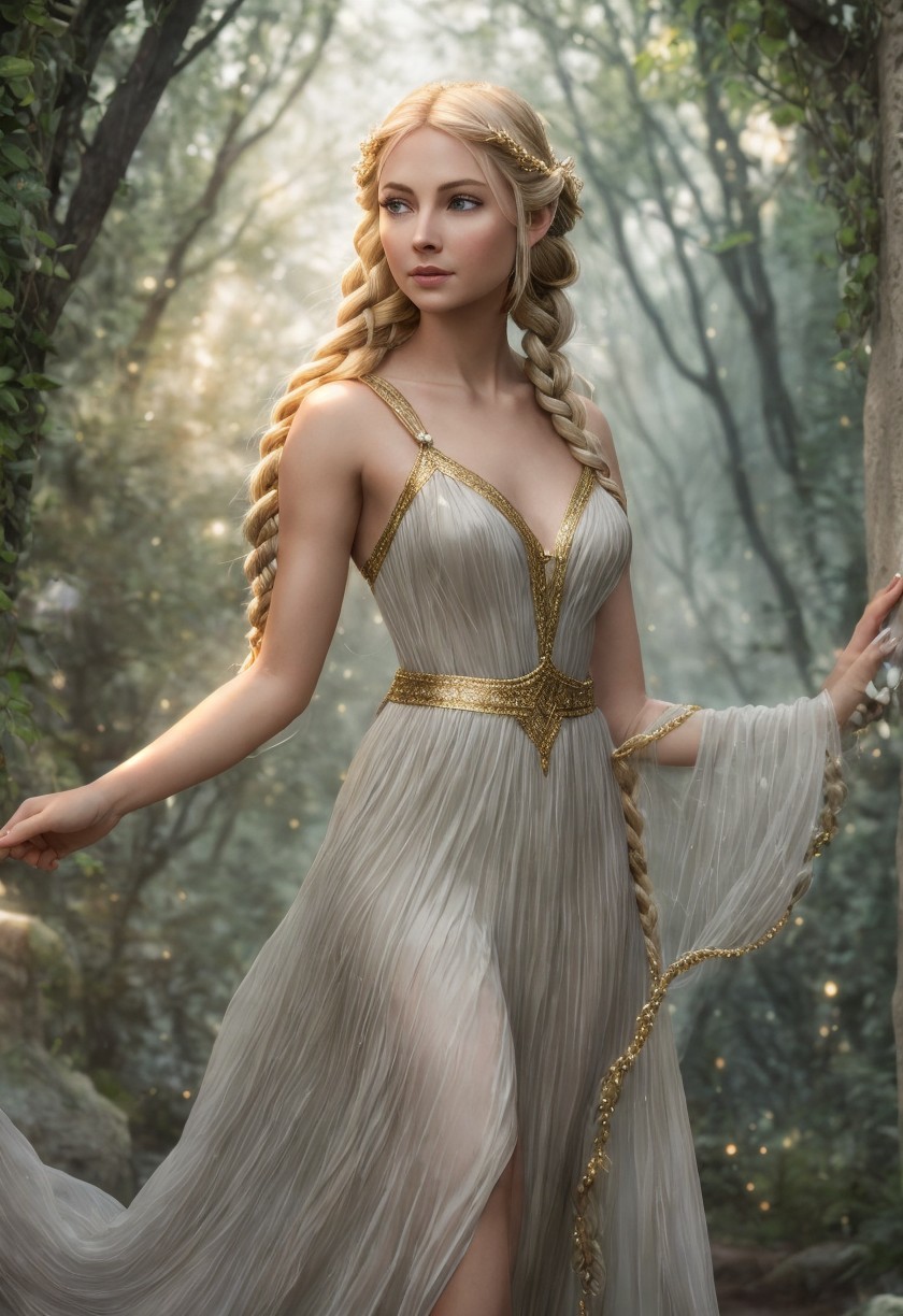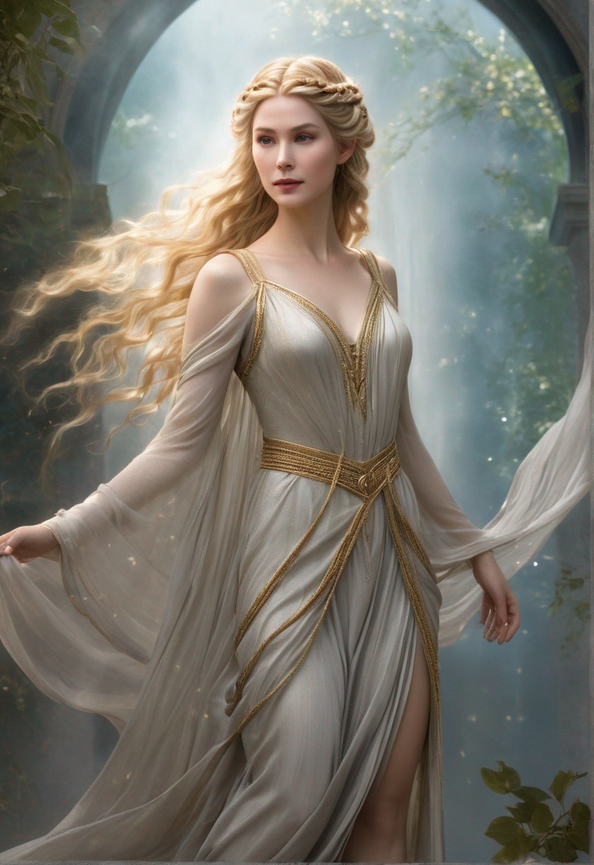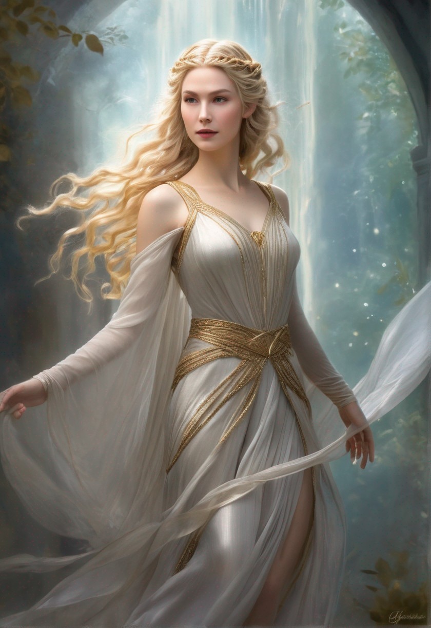 portray Galadriel full body and facing the viewer, inspired by the elegance of the Gold Dust fountain pen and Inkwashed techniques. Her expression is determined and courageous, highlighting an elaborate braided hairstyle. Adorned in a light, semi-transparent dress, she exudes a touch of allure and sensuality. Galadriel's deep, wise eyes, along with her cascading golden hair, catch the light, emphasizing her ethereal beauty and grace. She wears a sparkling, semi-transparent white dress, adorned with subtle floral details and jewels, enhancing her enchanting aura. In one hand, she holds a vial filled with Eärendil's starlight, casting a soft, hopeful glow. On the other hand, a silver staff with a shining crystal rests next to her, symbolizing her power and wisdom. The background is simple, focusing solely on Galadriel, with a hint of Lothlórien's beauty in the form of distant, indistinct trees, and soft, golden light filtering through. The illustration captures subtle nuances, including skin textures and eye reflections, resulting in a captivating visual experience that resonates with enthusiasts of elegance, fantasy and the extraordinary.