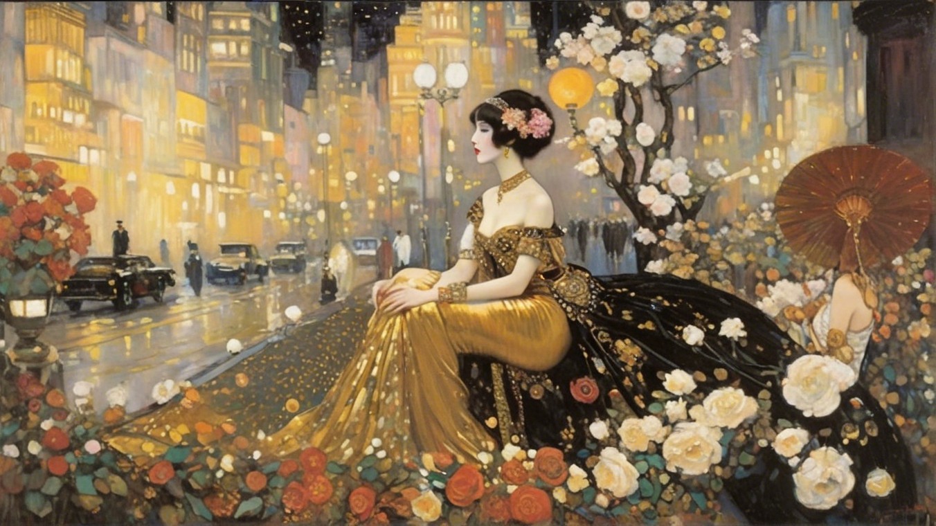 The image depicts two elegantly dressed women in stunning gowns, one golden and one black, seated amidst a vibrant cityscape with lanterns, vintage cars, and umbrellas, evoking a nostalgic ambiance.