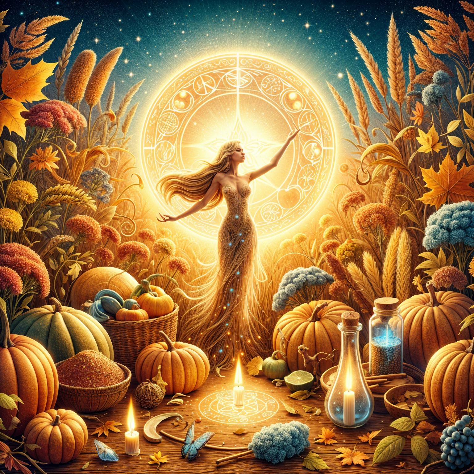 A majestic figure in a golden dress stands amidst vibrant autumn leaves and pumpkins, holding an apple. A radiant sun mandala glows behind her, evoking a sense of seasonal magic and abundance.