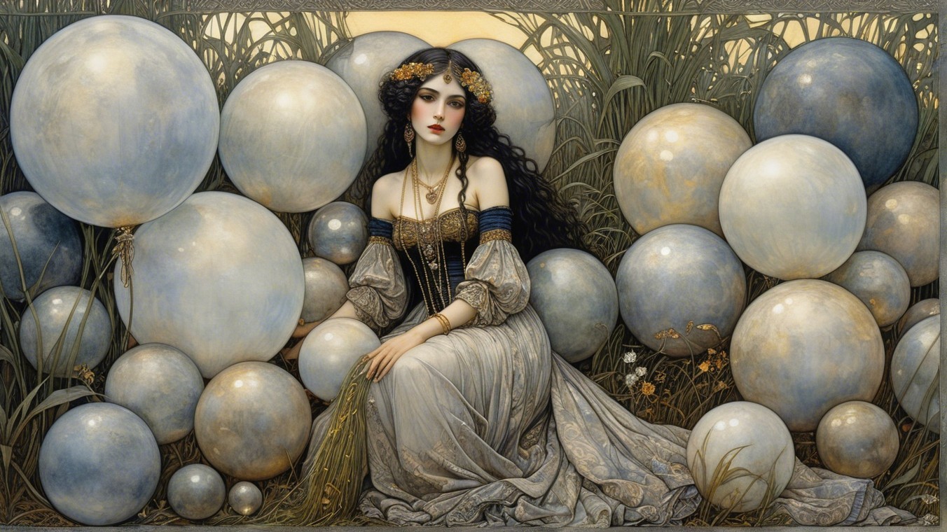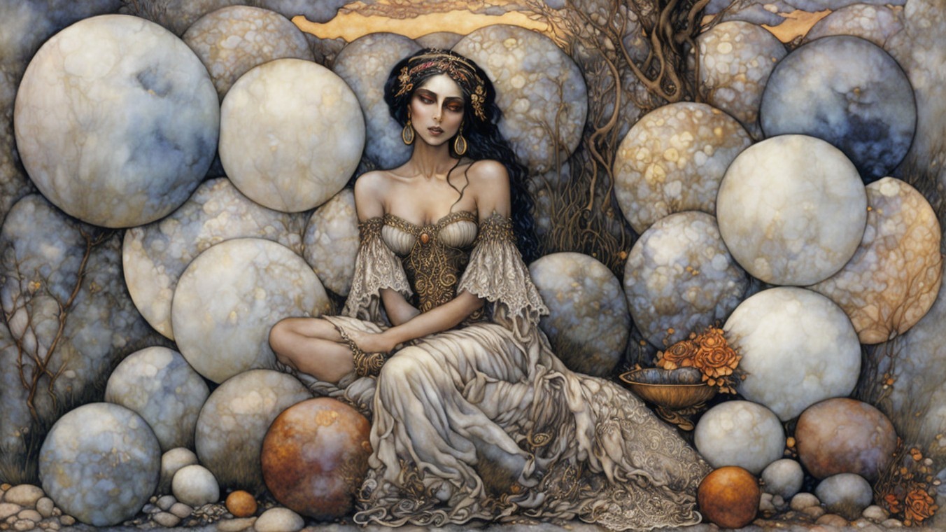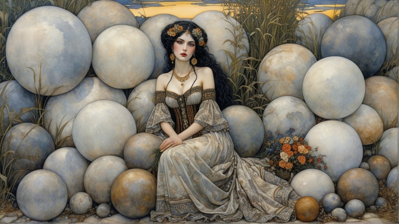 A mystical woman with long, flowing black hair sits gracefully among large orbs, adorned in a white gown accented with intricate gold designs. The serene landscape enhances her enchanting presence.