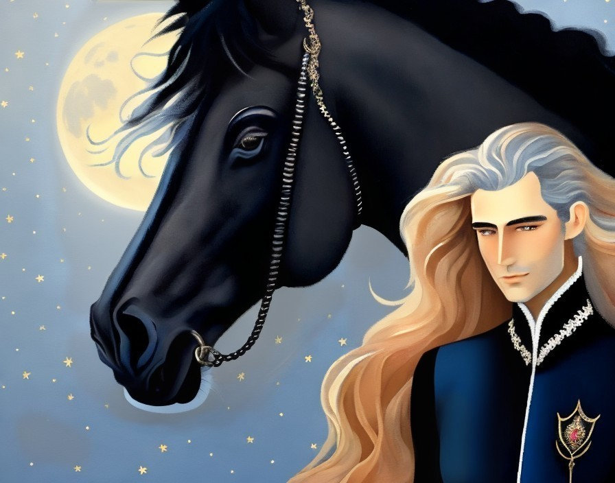 An illustration of a man with long silver hair and formal attire beside a black horse against a starry, moonlit sky.