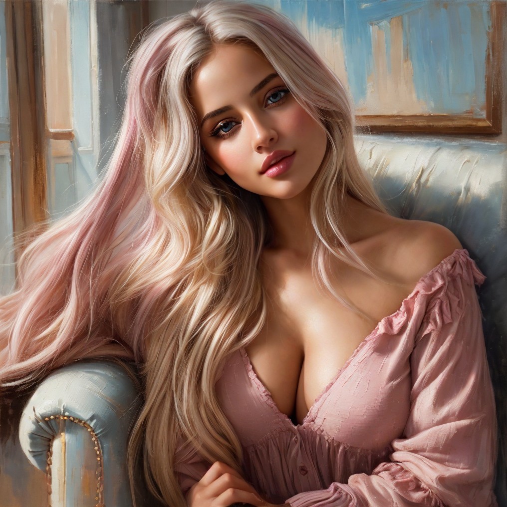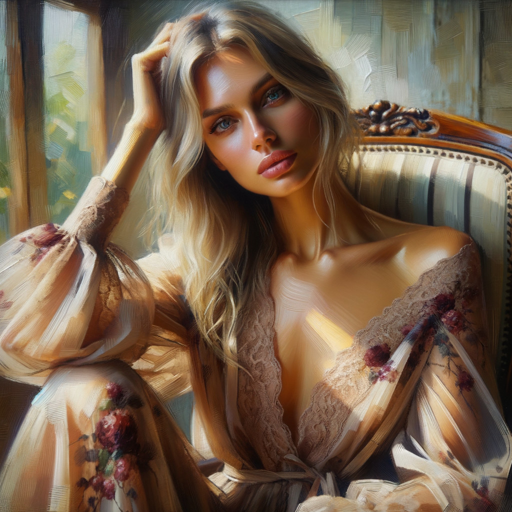 Prompt: "picture in a technique of textured impasto painting with thick brush strokes, wide and deep range of soft and warm color pallet: a passionately loved woman in the intimate moment.The woman's eyes are strikingly expressive, large, open, light blue color, lips are pink, rich. Her long light blond hair, with a few dark highlights is messy. the woman wears an long open dress that easily slips on her feminine figure in almost transparent silk flowered burgundy wine color, open neckline with tiny straps, one strap slipped over the shoulder. A woman's skin with a light sun tan, emphasizing the shape of a woman's face and chest. A woman is sitting on an armchair, she is slightly relaxed, leaning her head slightly against the chair's support, her hands are resting on the arm of the armchair. Her gorgeous high-heeled shoes are thrown nearby on the wooden floor nearby. The environment easily merges with the large window of the room next to it. "golden hours"lighting, to illuminate gently the woman's body, reducing harsh shadows and highlighting subtle facial features. Inspired by Lucian Freud, Willem de Kooning, Rembrandt van Rijn"