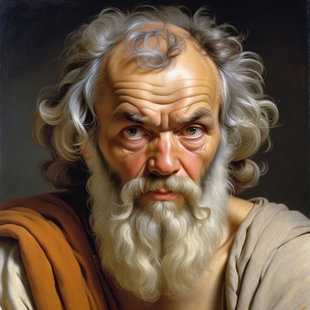 Prompt: Realistic Portrait of a classical philosopher; Sorates an elderly man with a solemn facial expression, deep-set eyes, and a prominent, furrowed brow. His skin tone is a realistic light caucasian. Socrates possesses a robust body with visible subtle age marks. He has a long, flowing, curly white beard that reaches down to his chest and long, wavy white hair that cascades down to his shoulders. The man's head is slightly tilted, and he gazes out thoughtfully towards the viewer, marking the seriousness of the subject. He holds a parchment scroll in his left hand, lifting it for the viewer to see, with Greek inscriptions visible; his right-hand grips a thin, reed-like object. He is draped in a oga that leaves his chest bare and casts soft folds over his torso and arms, hanging off his left shoulder, adding a sense of nobility to his demeanor. Against a muted, dark background, the figure stands out, with the focus intentionally drawn to the subject and the scroll in his hands,The painting should feel like a classical, Renaissance-era portrait, in Da Vinci style , capturing the wisdom and gravity befitting a philosopher or sage. Romanticism, Flemish Baroque, Oil On Canvas. Rose Tones