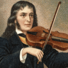 A young man with shoulder-length dark hair and a gentle expression holds a violin. He wears a formal dark coat with a white shirt and bow tie, set against an ornate patterned background.