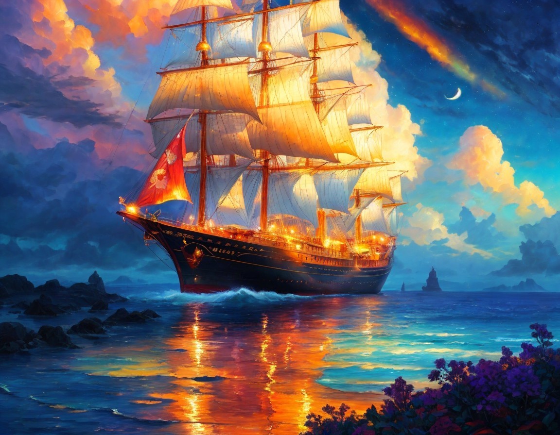 a giant fantasy ship sailing from 2023 island to 2024 island. the ship is manned by each and everyone of us