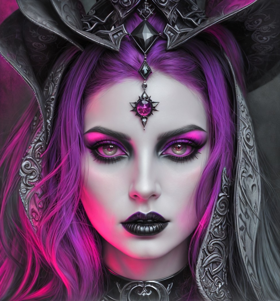 Gothical empress, close up portraiture, vampirical, eerie, occult, dark charcoal sketch, pale colors, saturated colors, plasticity 1.6, radiance, highly detailed, gothical background, brushed textures, stylized illustration 1.5, tints of 1970s advertising art, charcoal and inkpunk textures, negative-digital, devilish eyes, tints of William Timlin and Margaret Keane, hues, highly chipped background, flares, finest strokes, detailed zentangle hairdo in gothical style, triadic color scheme pink grey black, eldritch appearance, octane render illustration, (dreamscape, mystical symbolism, (erotic essence, alcoholic inkpunk 1.8) 8:5), colorful surrounding, chiaroscuro lighting in background, psychedelic psychpomp scene, high coloring 1.9, grain, brightness 1.4