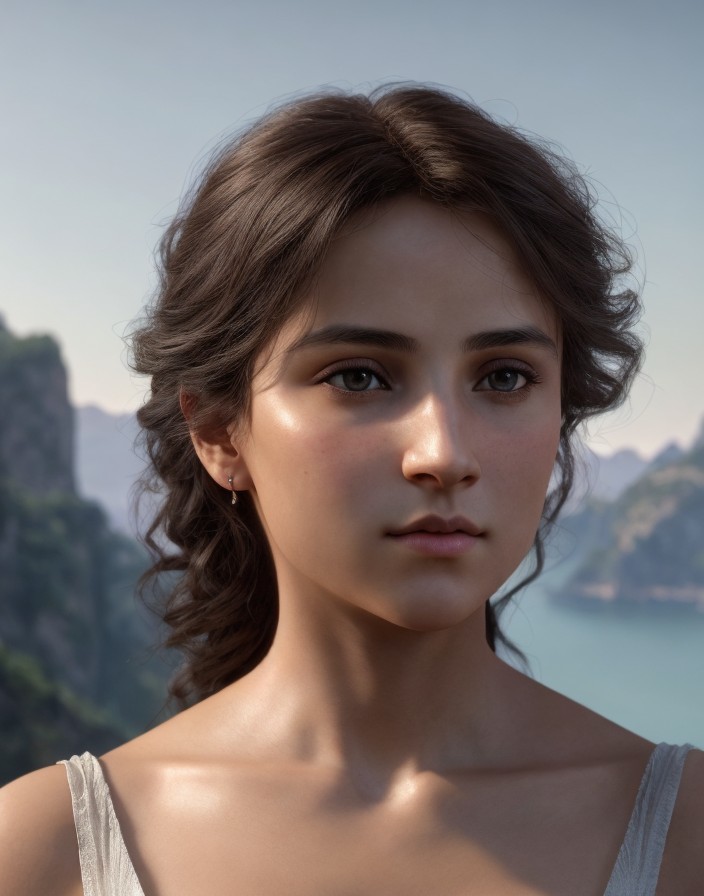 A portrait of a young woman with brown hair and eyes, white dress, with a serene coastal background.