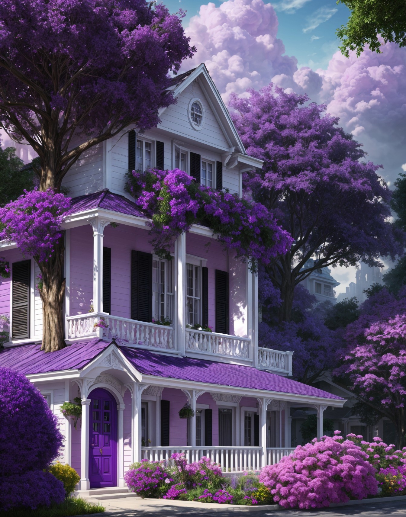 A beautiful purple house surrounded by lush purple trees and vibrant flowers. The charming architecture features ornate details, a welcoming porch, and a dreamy sky filled with soft clouds and birds.