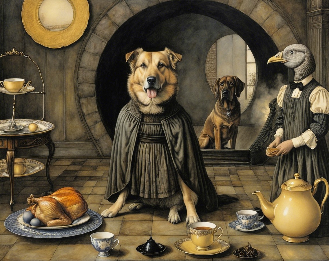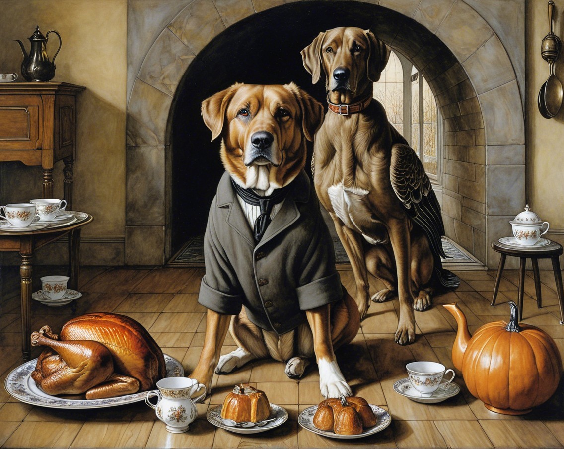 A whimsical scene features a pug and a turkey in a cozy room. Elegant teacups are placed nearby, and a small pumpkin adds a festive touch to the charming setting.