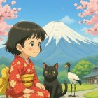 Two young girls with bobbed hair stand in a whimsical landscape, wearing colorful traditional garments. A black cat and birds surround them, with towers in the background adding to the surreal charm.