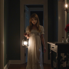 A young girl in a white nightgown stands in a dimly lit hallway, holding an old lantern. Shadows loom nearby, and a rose rests on a table, creating an eerie yet captivating atmosphere.