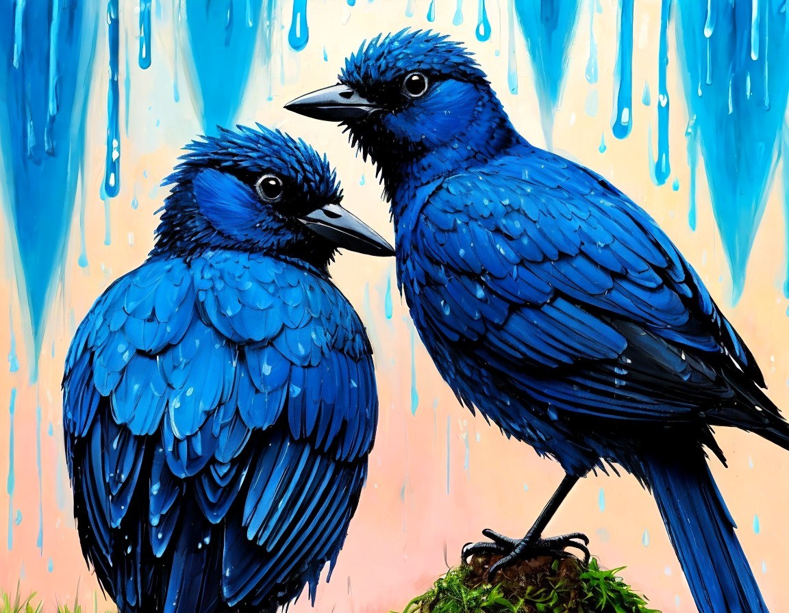 Vibrant Blue Birds Perched on Rock in Rainy Background