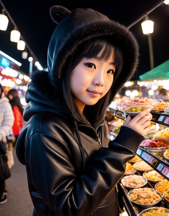 ("Try it" from other user) - A woman in a black hoodie and jacket is browsing a night market with food stalls in the background.