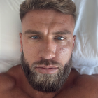 The image features a smiling man with a muscular build, displaying a well-groomed beard and stylish haircut. He is shirtless, showcasing a prominent tattoo on his arm. Bright blue eyes add to his cheerful demeanor.