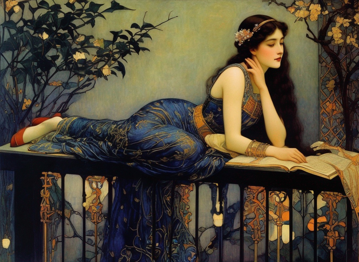 A woman in a blue dress lies in repose amidst a vibrant, flower-filled meadow, her expression peaceful and contemplative.