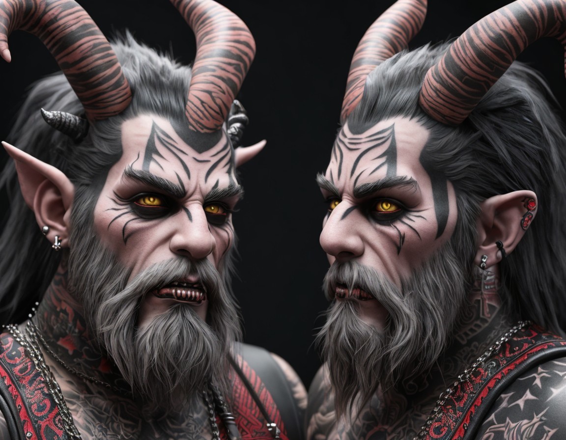 Identical fantasy characters with horned heads, pointed ears, and tribal face tattoos