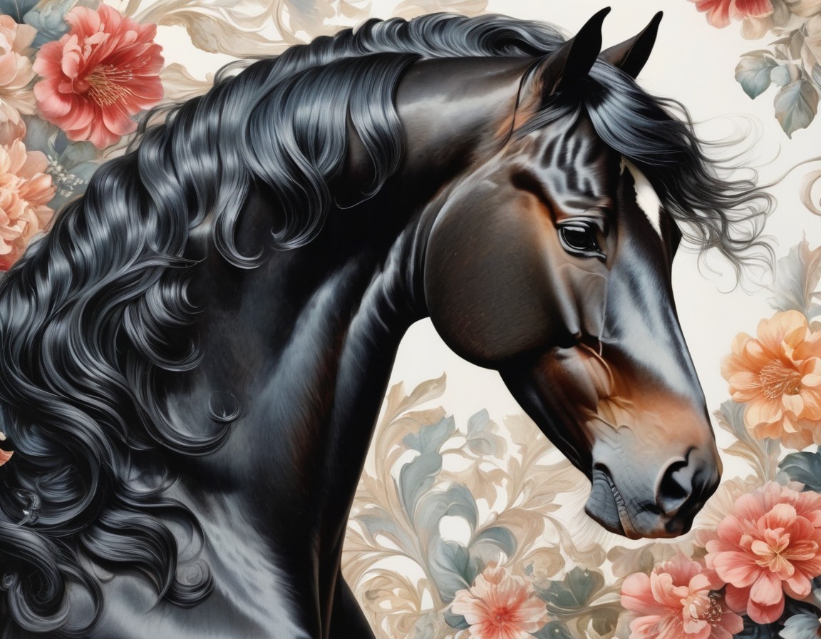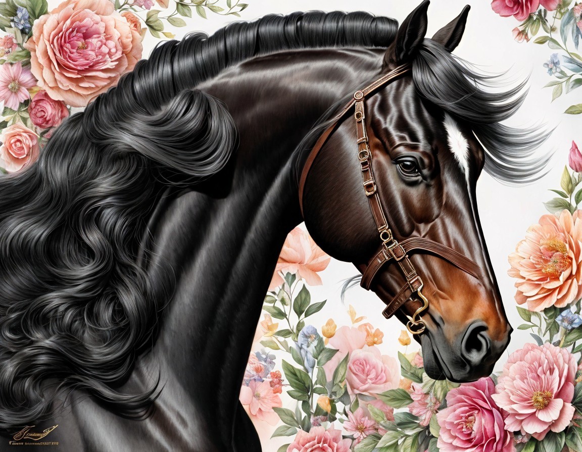 An illustrated black horse with a floral mane among roses.