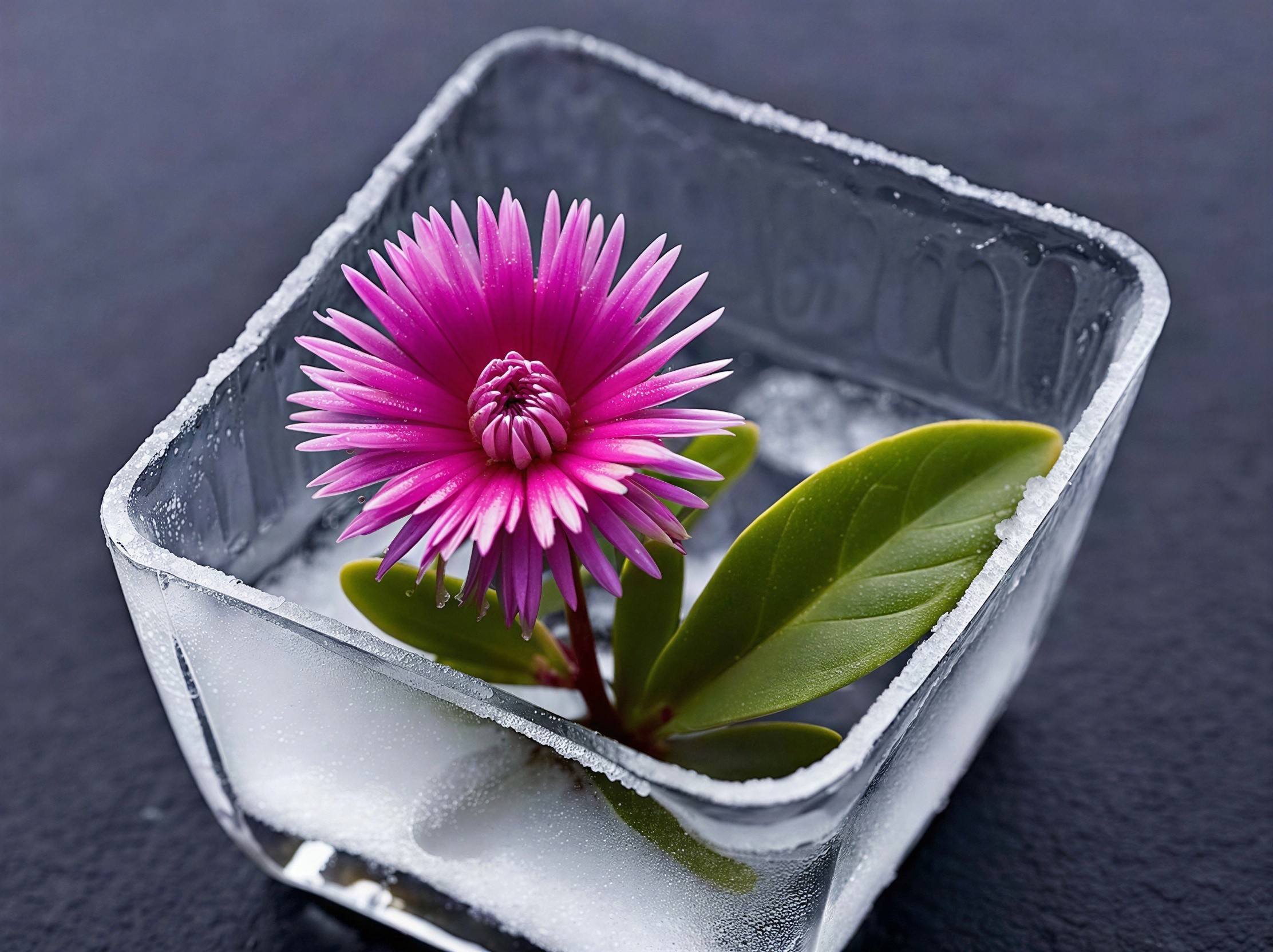 A close-up shot of a small, vibrant magenta flower with a multitude of thin petals and a tightly packed center, nestled inside a clear, rectangular ice cube. The ice cube is frosted on the inside and along its edges, with visible condensation and small ice crystals. A few bright green leaves are