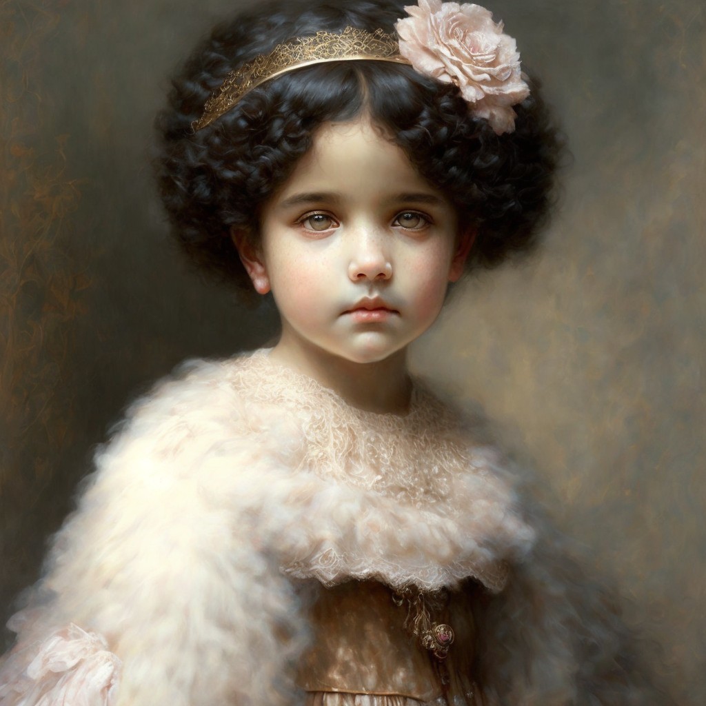 Young girl with dark curly hair in crown and white dress with pink flower gazes solemnly