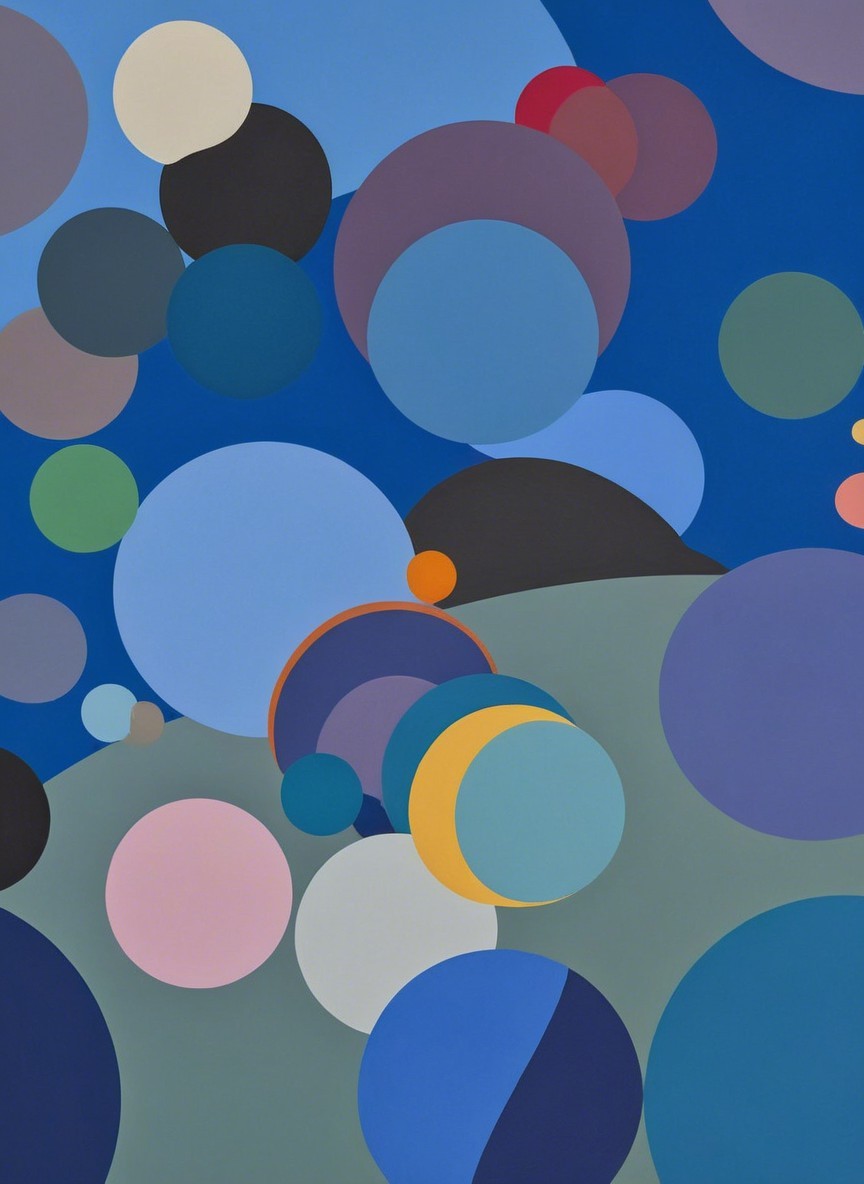 A surreal illustration featuring a large insect perched on colorful, abstract planets against a deep blue space background filled with stars and celestial bodies.