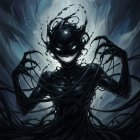 A sinister, shadowy figure with elongated limbs and sharp teeth emerges from dark tendrils. Its malevolent grin and glowing eyes convey an eerie, otherworldly presence.
