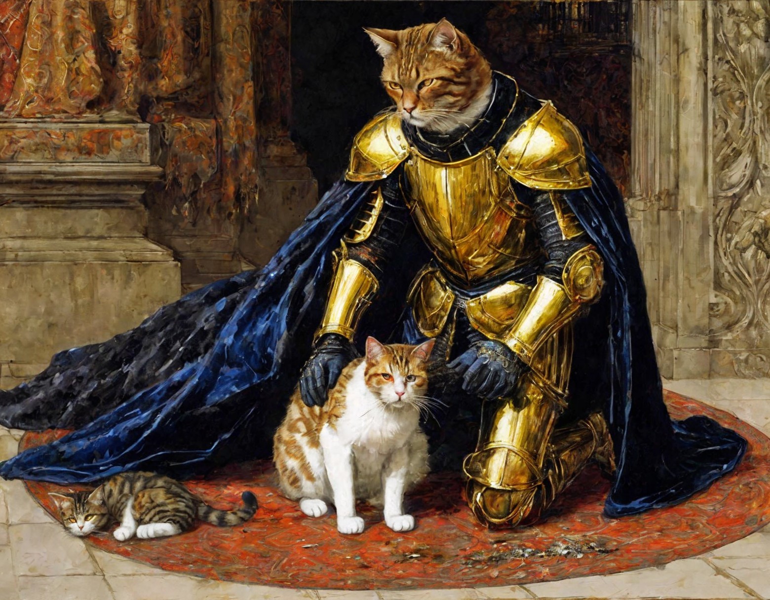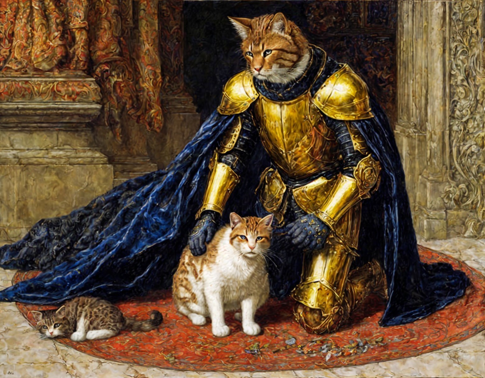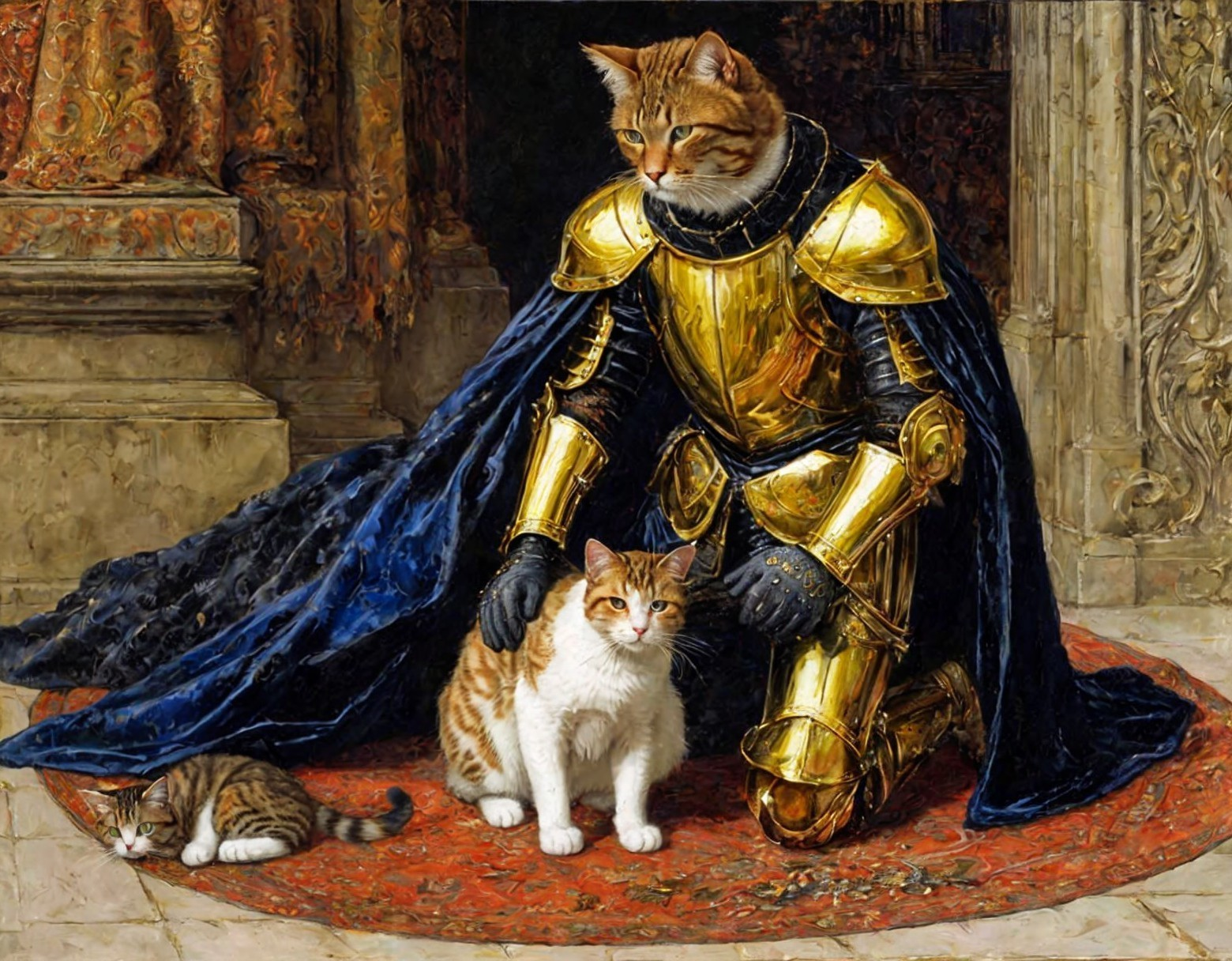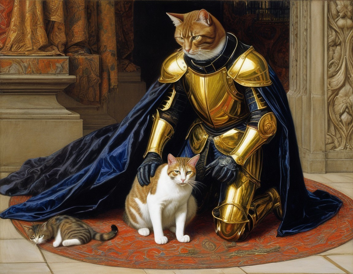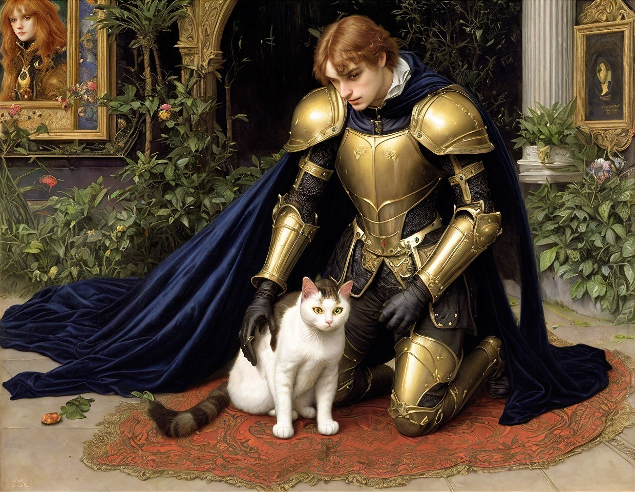 (Old try from other user) - A knight in ornate golden armor kneels on a richly patterned rug, gently petting a white cat. Lush greenery and elegant portraits frame the enchanting scene, blending nobility and tranquility.
