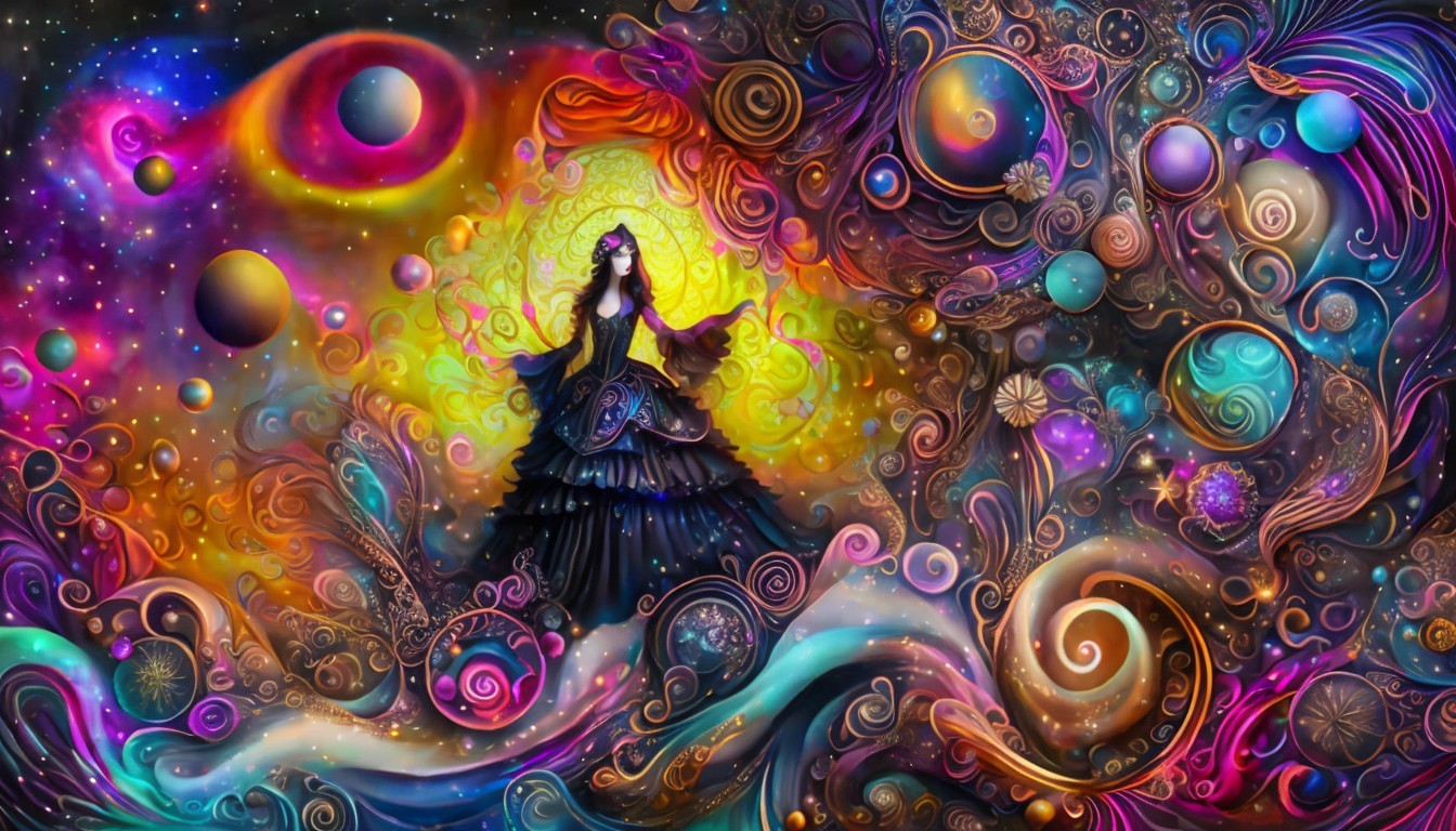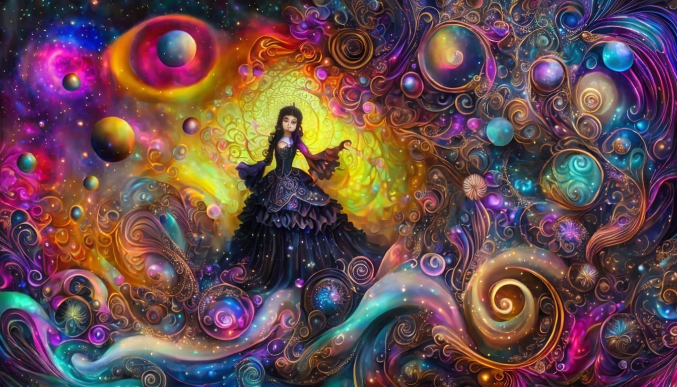 Prompt: beautiful face of magical nocturnal gothic beauty lady, galaxy bubbles spirals, tim burton style intricate surreal details in a whimsical fantasy landscape filled with swirling patterns and vibrant colors. The scene is dominated by intricate, swirling designs resembling stylized decorative swirls and with a rich texture of magical elements. The arrangement of the spirals gives a mesmerizing sense of movement and depth, with the brushwork.