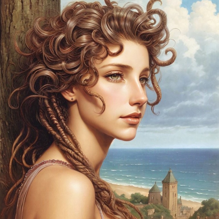 Portrait of young woman by seaside with ship and castle in background