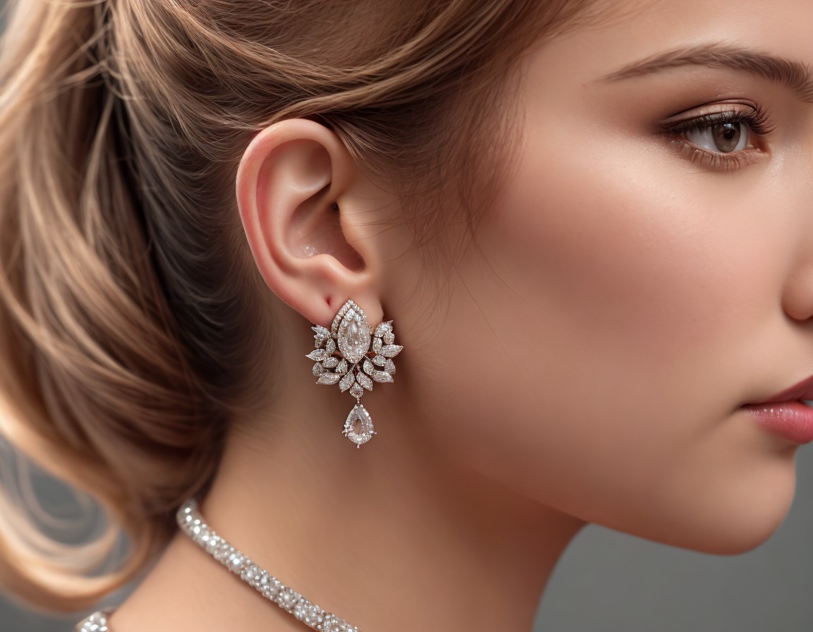 Diamonds around a neck and on ears of a beautiful dark-haired female with green eyes.